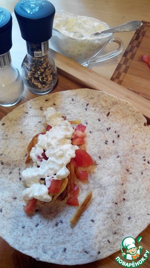 На лаваш выкладываем мясо, картофель, помидор, соус. Сворачиваем лаваш конвертом.