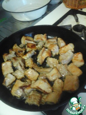 Свинину нарезать кусочками с половинку спичечного коробка. Посолить, поперчить.