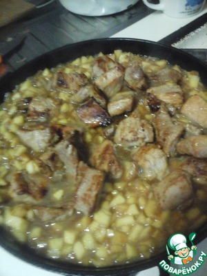 Под таким названием эта замечательная свинина с яблоками была мной обнаружена, и я решила ничего не менять))) Уютное и сытное блюдо, отличное сочетание мяса и фруктов... Мы ее полюбили с первого укуса))) Эта свинина хороша с любым гарниром, облагораживает и кашу, и картофель, и макароны - и значит, решает вопрос "чем накормить семью", а не только "чем бы вкусненьким побаловаться&quo t;:) Делюсь от всей души, по-дружески, одним словом!