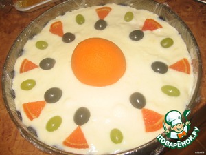 В даном варианте: в центр установить 2/3 апельсина, срезом вниз, прямо до теста, йогурт его должен удерживать. Украсила виноградом и апельсиновым мармеладом, можно апельсиновыми дольками. Приготовление птицы пошагово смотрите http://www.povarenok .ru/recipes/show/127 57/