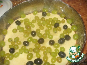 Половину бисквита положить в форму, выстеленную пищевой пленкой. Выложить виноград (я брала киш-миш целиком в центр, а крупный синий разрезала пополам и сделала ободок), залить апельсиновым желе.