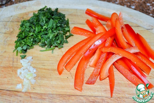 Перцы вымыть, удалить семенную коробку ( у чили аккуратно, очень острый). Нарезать чили на кружочки, сладкий перец на полоски.
