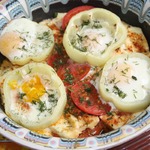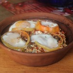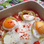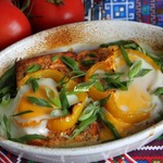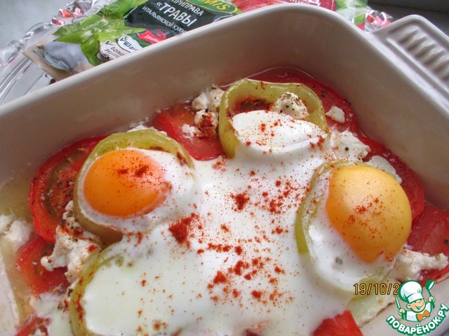 В случае других вариантов, укладываем поверх помидорок еще один слой нарезанной или раскрошенной брынзы, а затем ложкой делаем в нем что-то вроде кратера. Присыпаем чабером и паприкой. Убираем горшки в духовой шкаф, разогретый до температуры 220 градусов, на 20 минут. За время запекания брынза осядет почти вдвое. Разбиваем на верхний слой брынзы одно яйцо, в моем случае в кольцо перца и возвращаем горшки в духовку. Запекаем минут 5-7, не больше.