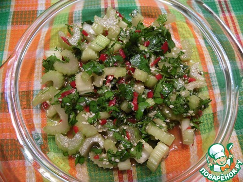 Сельдерей нарезать небольшими кусочками, чили и кинзу мелко нашинковать.
