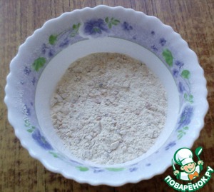 Отдельно смешать просеянную с разрыхлителем муку и дроблённые орешки (у меня арахис).