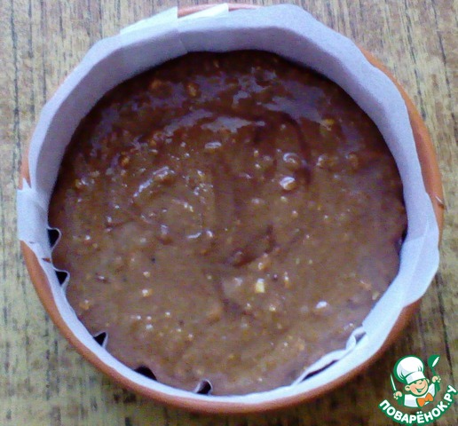 Форму застелить пергаментом (если силиконовая, то можно и без пергамента обойтись). У меня глиняная форма размером 15см в диаметре.