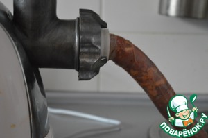 Предварительно вымытые и вымоченные кишки начиняем фаршем и формируем колбаски, периодически на равном расстоянии закручивая кишки.