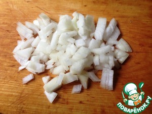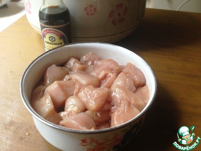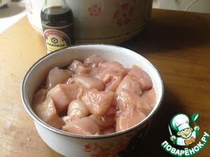 Филе вымыть, обсушить, нарезать кусочками, сложить в миску и залить соевым соусом.