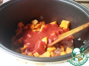 Добавить тыкву в чашу мультиварки, томатный соус, 1/2 мультистакана воды. Поперчить, закрыть крышку, включить режим "Тушение" и готовить до окончания режима.