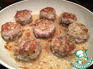 Как только все котлеты пожарятся, верните их обратно на сковороду вместе с выделившимся соком, сделайте огонь как можно тише (у меня плита электрическая, я ставлю на 3),