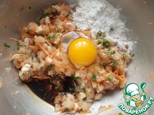 Добавить измельченную зелень, яйцо, крахмал и соевый соус. Добавить немного тимьяна. Если у вас маленькие яйца, добавьте 2 штуки.