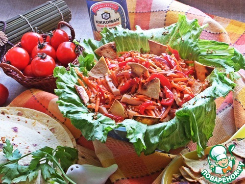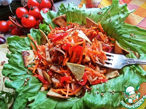 В салатник укладываем салатные листья, сверху весь салат. Украшаем хрустящими чипсами и семечками кунжута.