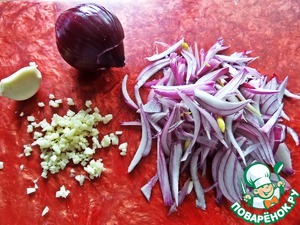 В это время чистим лук, чеснок. Лук нарезаем тонкими полосками, чеснок просто измельчаем.