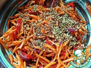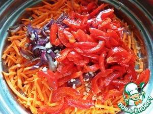 Помягчевший перец высыпаем вслед за луком к морковке. Остатки масла можно вылить тоже в салат.