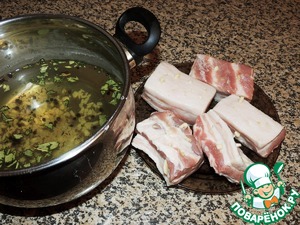 Остальной чеснок нарезать тонкими брусочками и нашпиговать грудинку. Поместить сало в теплый маринад.