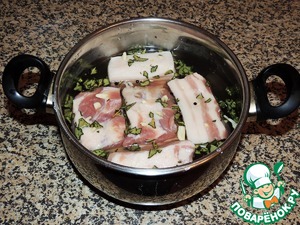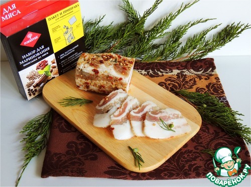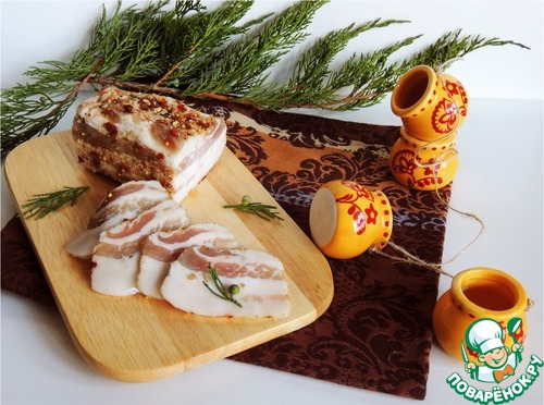 Оставить грудинку в маринаде на сутки при комнатной температуре, затем подержать еще двое суток в холодильнике, переодически переворачивая куски.