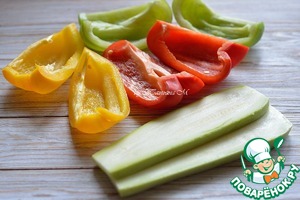 Перцы разрезать на части, освободить от семян, кабачок порезать на слайсы;