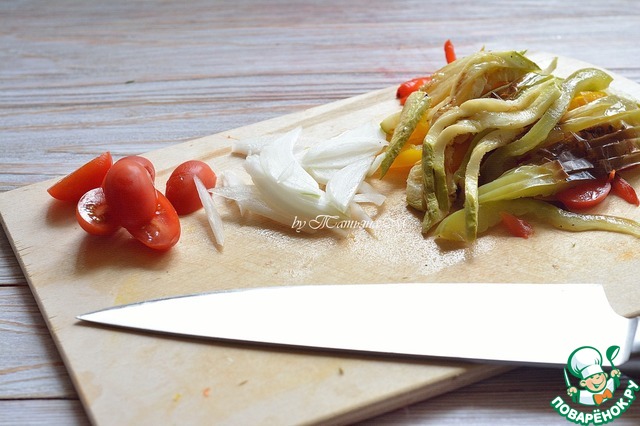 Перцы (можно очистить от кожурки, я никогда не чищу) и кабачок, порезать тонкими полосами, добавить полукольцами лук, половинки помидор;
