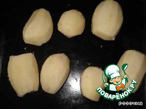 • Картофель очистить, натереть солью, положить на противень и запечь в духовке до готовности.