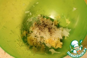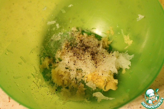 • Имбирь, чеснок и лук натереть на мелкой терке, поперчить.