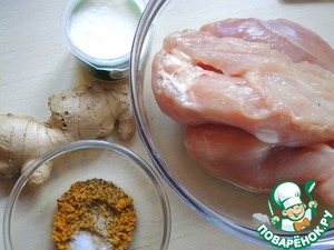 Имбирь очистить и натереть на мелкой терке, добавить йогурт, карри, перемешать. Куриные грудки со всех сторон натереть солью и перцем.