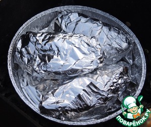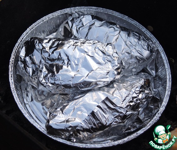 Затем, каждую грудку завернуть в фольгу, положить в металлическую тарелку (или из плотной фольги) и поставить прямо на угли на 10 минут, желательно один раз перевернуть. Немного остудить, развернуть, нарезать поперек на толстые кусочки и подавать к столу!
