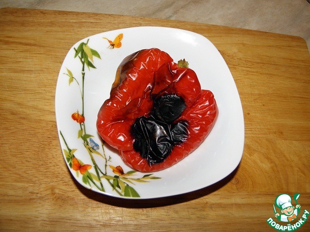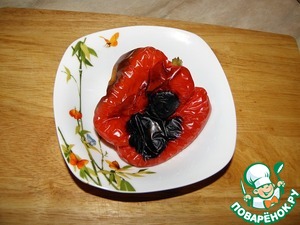 Перцы разрезать пополам, очистить от зерен и плодоножки, запечь на углях до "черных ожогов" Если в духовке, можно целыми (а потом все удалить)