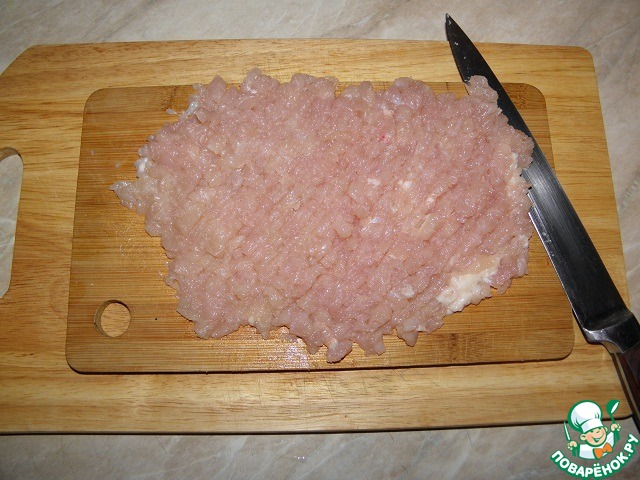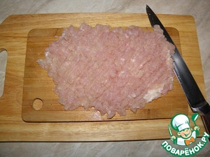 Куриное филе порубить в грубый фарш. (только не пользуйтесь мясорубкой!)