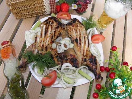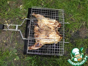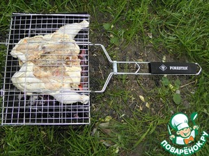 Птицу освобождаем от маринада ( лук нужно убрать) Когда угли готовы, выкладываем цыпленка на решетку FORESTER. одеваем зажим, ставим решетку на мангал с углями, угли должны тлеть