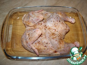 Тушку цыпленка надрезаем по грудке, слегка отбиваем, натираем специями "Шашлык с дымком" от FORESTER