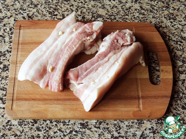 Грудинку (лучше выбирать мясную маложирную) нашпиговать с помощью острого ножа тонкими брусочками чеснока.