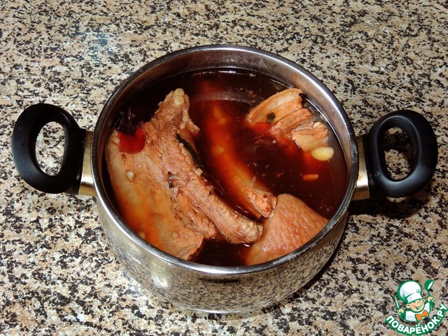 Луковую шелуху (ее можно взять и побольше), лаврушку, перец и соль залить кипятком и проварить 5 минут. Нашпигованную грудинку поместить в рассол и варить 1 час.