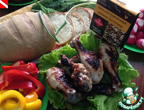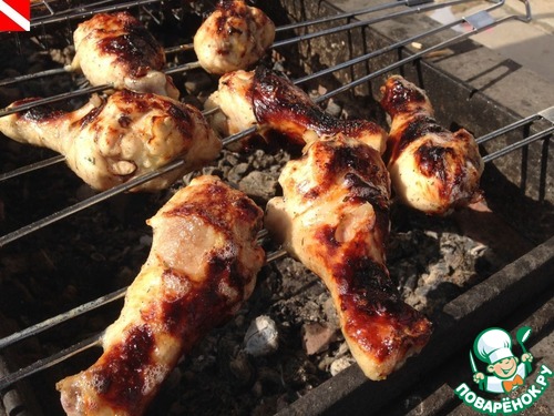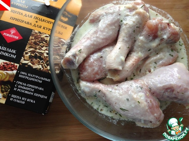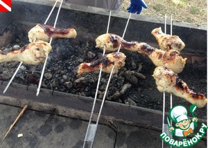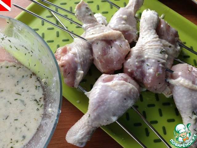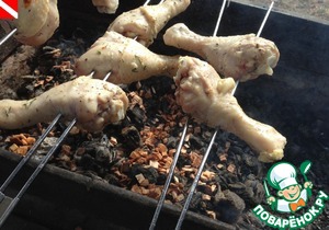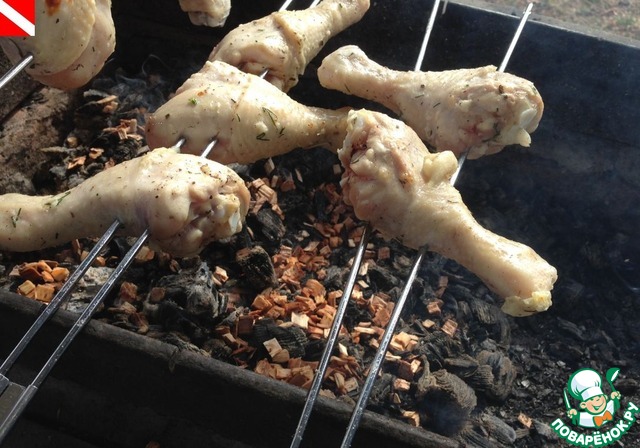 Тем временем. нанизываем голени на шампуры. А теперь вспомните, как ведут себя куриные голени на обычных шампурах. Постоянно крутятся? Эта проблема теперь решена - просто нужно использовать двойные шампуры от Forester. Очень удобно!