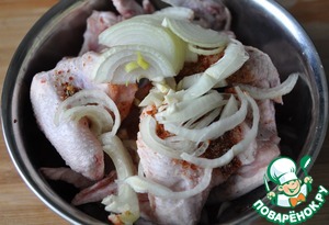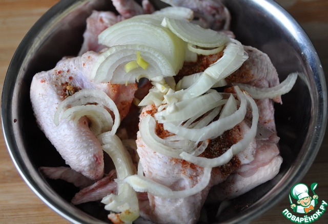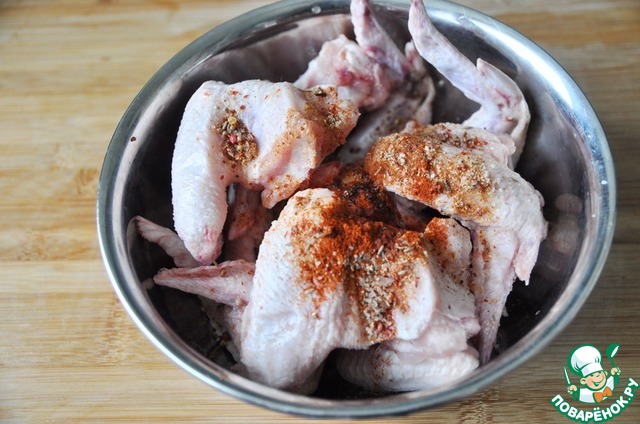 Берём куриные крылья и засыпаем их смесью для маринования от Forester.