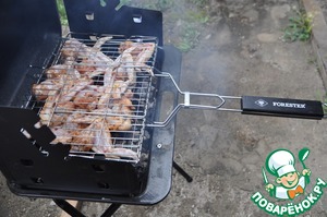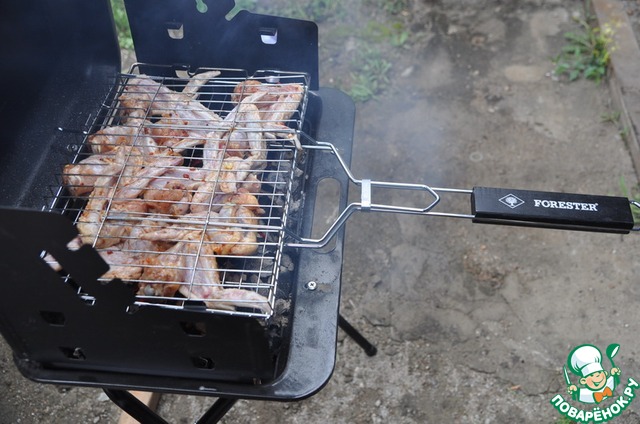 Крылья очищаем от лука и кладём на решётку (не плотно). Закрываем решётку.