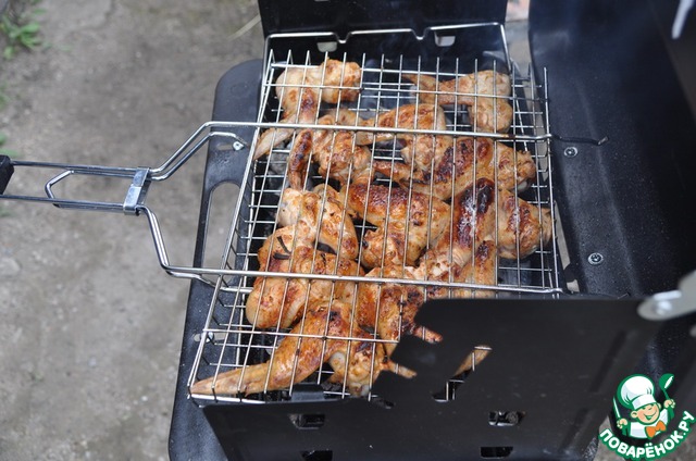 Запекаем крылья на углях, периодически переворачивая решётку. Общее время - около 20 минут.