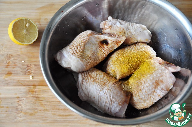 Добавляем соевый соус, мёд, порошок карри, смесь перцев, сок половины лимона, имбирь.