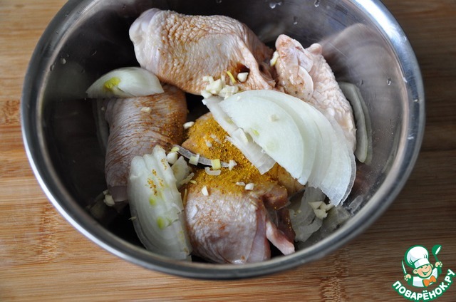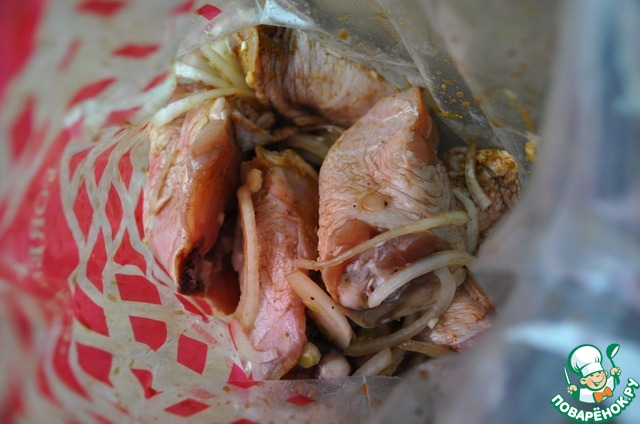 Хорошо перемешиваем, кладём для удобства в пакет и оставляем мариноваться на 2-3 часа.