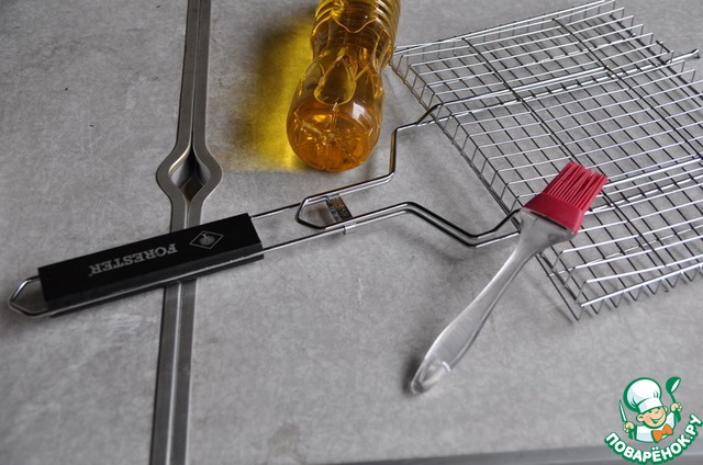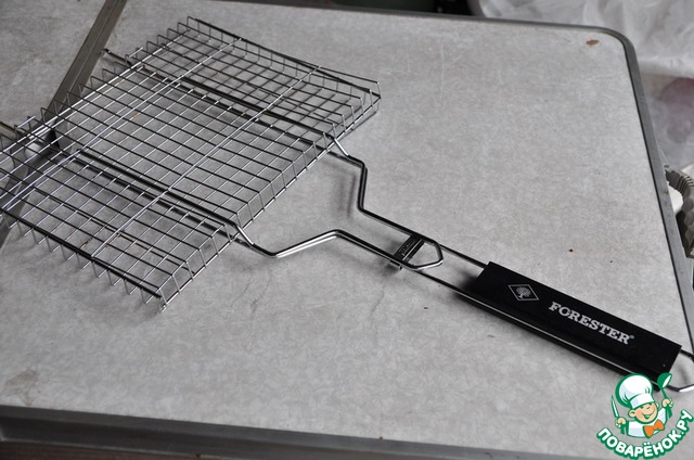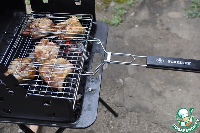 Для приготовления бёдрышек берём решётку-гриль от Forester. Решетка очень удобная. Она вместительная, можно готовить на большую компанию, у нее очень удобная длинная ручка и надежный фиксатор.