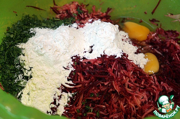Смешать свеклу, картофель, зелень, добавить муку, соль, перец, вбить яйца, все тщательно вымесить.