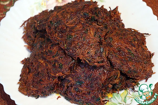 Традиционно драники готовятся из картофеля. Но почему бы не сделать их из свеклы? Ведь готовим мы лепешки по типу драников из кабачка, тыквы. Конечно, картофель здесь все-таки нужен, иначе очень уж ярким, очень уж свекольным будет вкус. Драники получатся слишком сладкими. Не помешает и зелень. Я не стал добавлять сюда лук, хотя после того как приготовил, подумал, что он бы здесь не помешал. С двумя ложками муки у меня тесто получилось жидковатым, хотя обычно на такой объем я добавляю муки именно столько. Видимо, все зависит от того, какой картофель. Поэтому варианты – на ваше усмотрение. Но больше трех ложек точно не нужно.