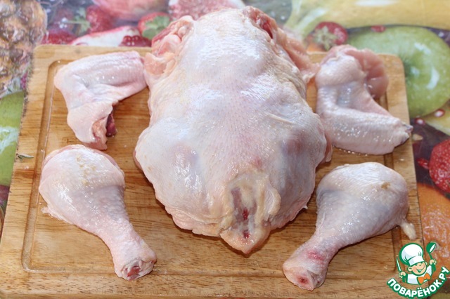 Курицу промыть, обсушить, разрезать на порционные куски.