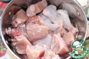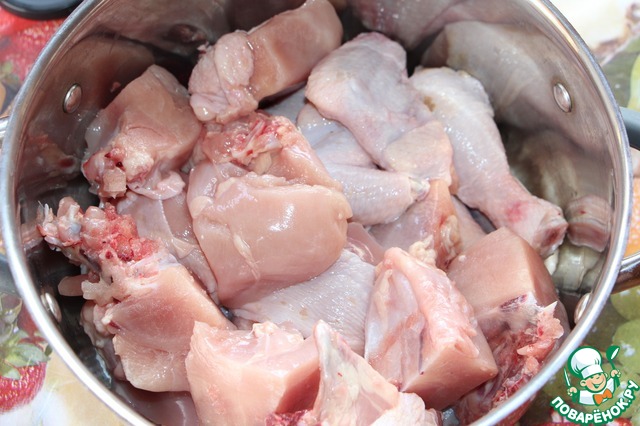 Сложить курицу, голени, крылья в большую кастрюлю, где шашлык будет мариноваться.