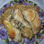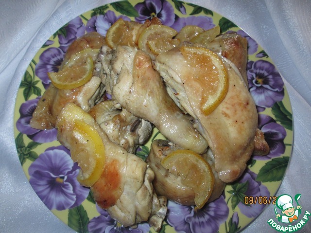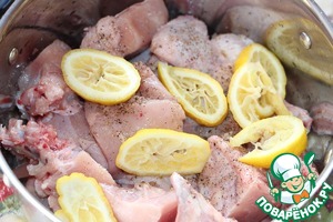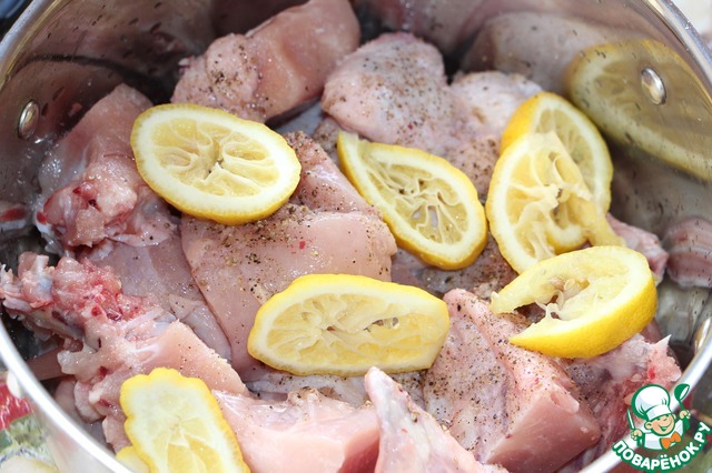 Из одного лимона выжать сок. Выжатый лимон, целый лимон нарезать дольками и добавить к курице и сок, и дольки лимона. Добавить перец, перемешать.