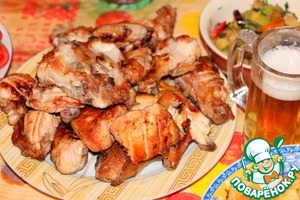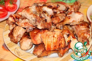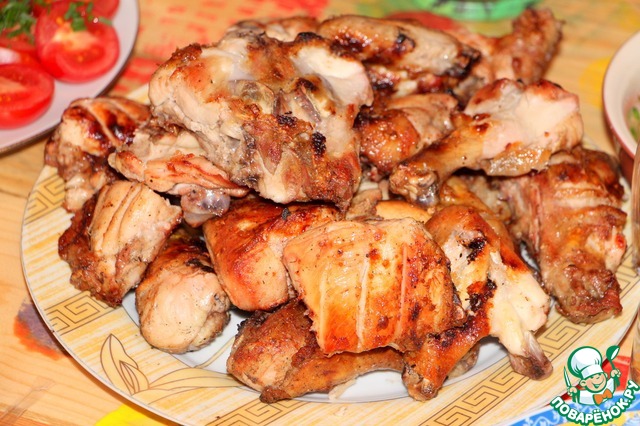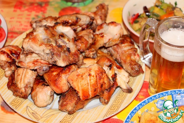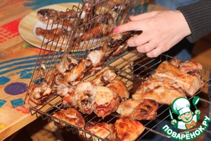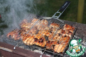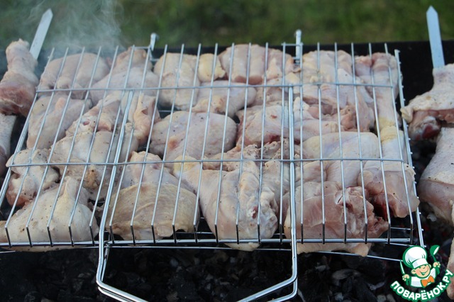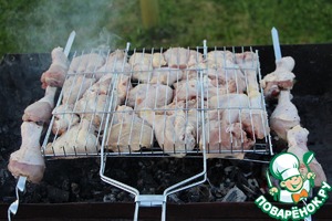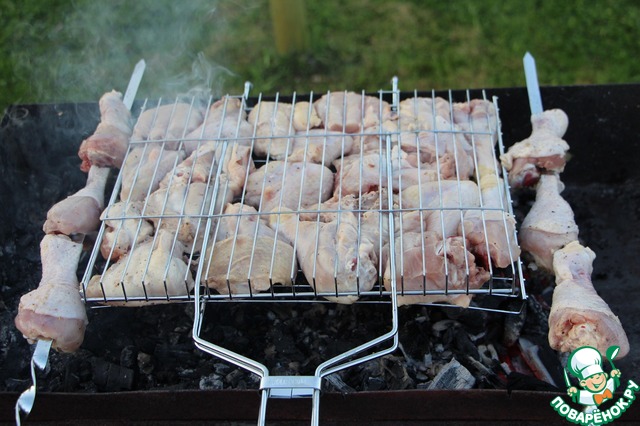 Разжечь угли, дать им прогореть, когда угли подернутся "седым пеплом", выложить кусочки курицы на решетку, посолить и поместить решетку на мангал. Усики-фиксаторы на решетке обеспечивают устойчивое положение на мангале.