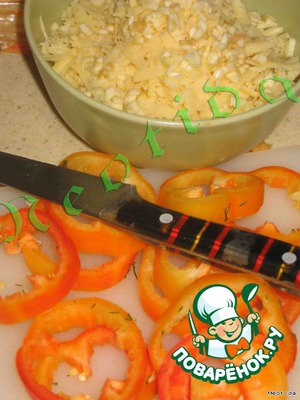 В центр перчика укладываем сыр и на сыр - креветочную массу. -