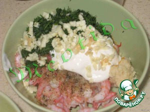 Креветочки почистить (можно взять где-то 200 г сразу почищенных), посолить и поперчить, добавить карри, хрен и сметанку.