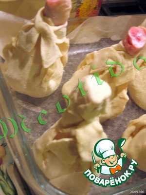 Ставим ножки в форму для запекания и повязываем на верхнюю часть ножек галстучек из теста (можно этого и не делать, но так надежнее будет, чтобы начиночка вся сохранилась внутри) и кусочком таста обворачиваем самый верх ножки.