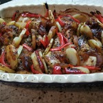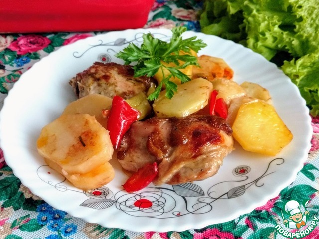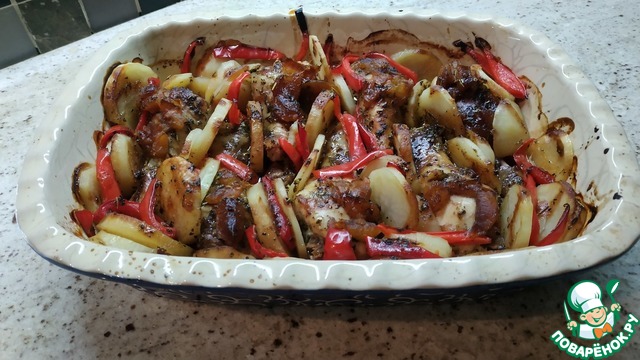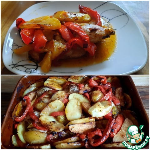 Перец выкладываем на картофель с курицей, а сливы только на курицу и поливаем оставшимся соусом.