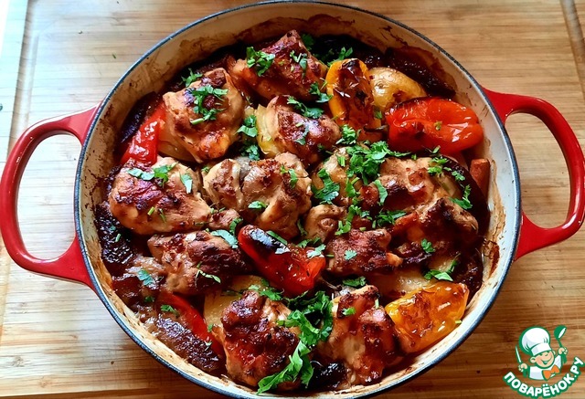 Я просто влюблена в блюда, которые готовятся одновременно - и гарнир, и основное блюдо. Это блюдо живет в нашей семье долго, одно из самых любимых - ничего не обжаривается - все просто выкладывается в форму, ароматы трав, сливы, которые просто рождены для этого рецепта, кусочки курочки и отличная заливка - это просто необходимо попробовать! Это блюдо можно и на праздничный стол подать - очень вкусное и красивое! А если до прихода гостей у вас есть час времени - это блюдо выручит вас! попробуйте!